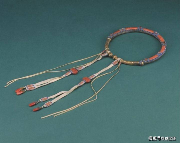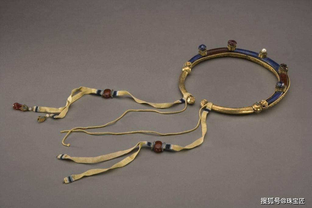 从形制上看,它是一个镂金的圆环形状,有开合式的活口,环上镶嵌宝石,活口处垂下两条绦。