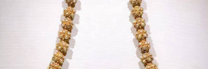 这条璎珞采用纯金制作,由28颗镶嵌着小珍珠的球形金链珠所组成,左右两边各有14颗,呈对称式结构,以金线穿起,项链搭扣中间镶嵌着凹雕有鹿纹的青金石。