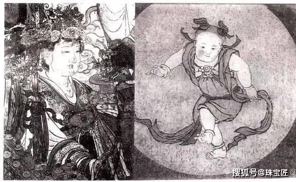 左:佩戴长命锁的天女 右:戴长命锁的童子