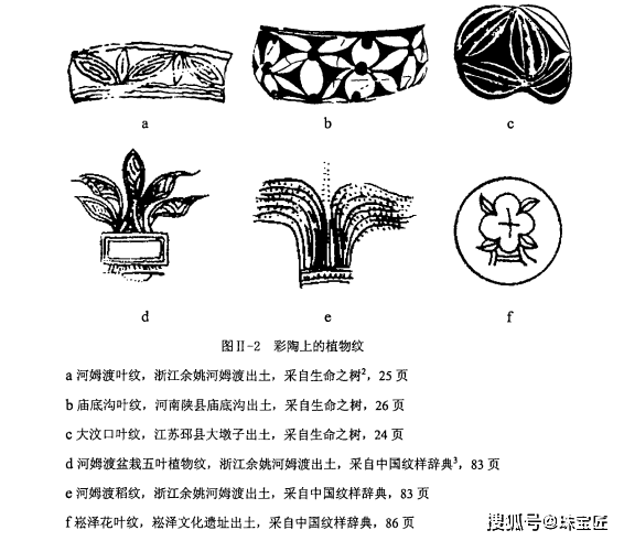 在中国早期社会,随着农业文化的发展,在河姆渡文化、大汶口文化、仰韶文化等时期的刻画纹饰与彩陶纹饰中都出现了反映农耕生活的植物纹饰,它们是树叶纹饰在中华大地上的雏形。