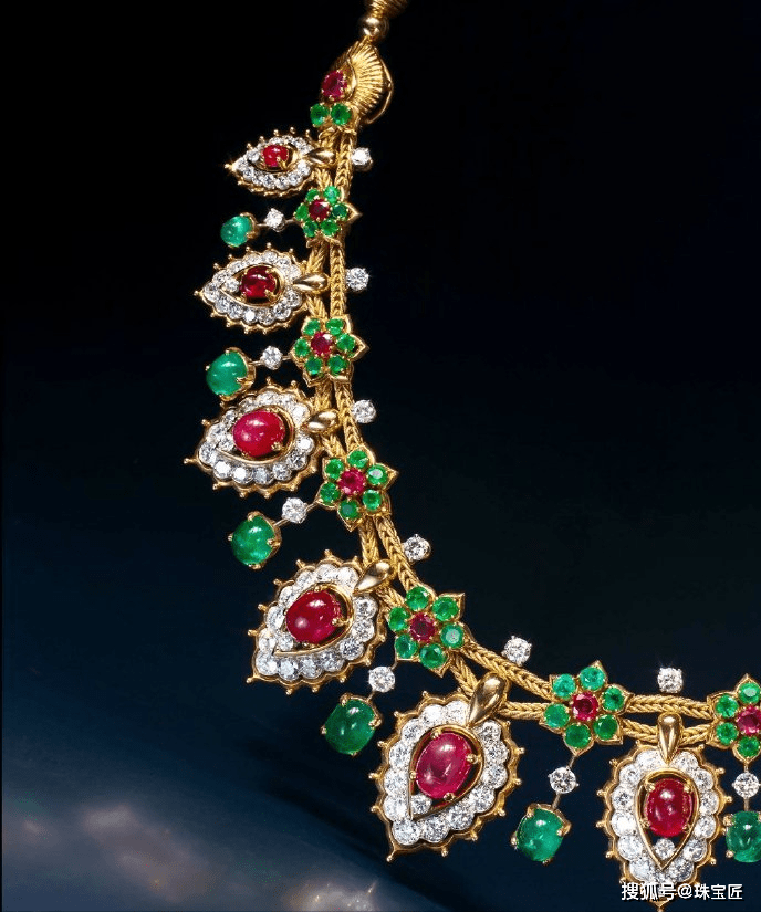 Necklace Of Oriental Inspiration 项链以菩提叶造型为设计元素,饰有9枚菩提叶造型吊坠和8枚花卉图,镶有祖母绿、红宝石和钻石; 项链采用18K黄金和白金制作。