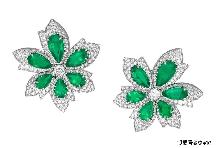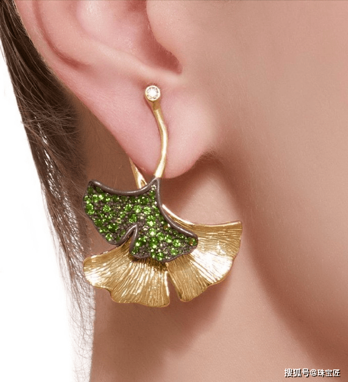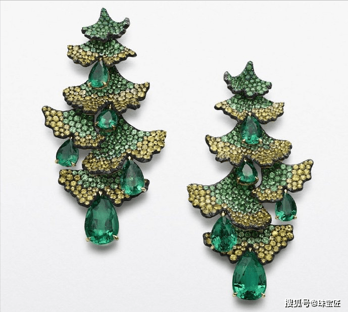 Chopard 2020年 Red Carpet 高级珠宝系列中Ginkgo 耳坠塑造出卷曲的银杏叶,表面铺陈祖母绿、沙弗莱石、黄色蓝宝石形成自然过渡,水滴形祖母绿成为引人注意的焦点。