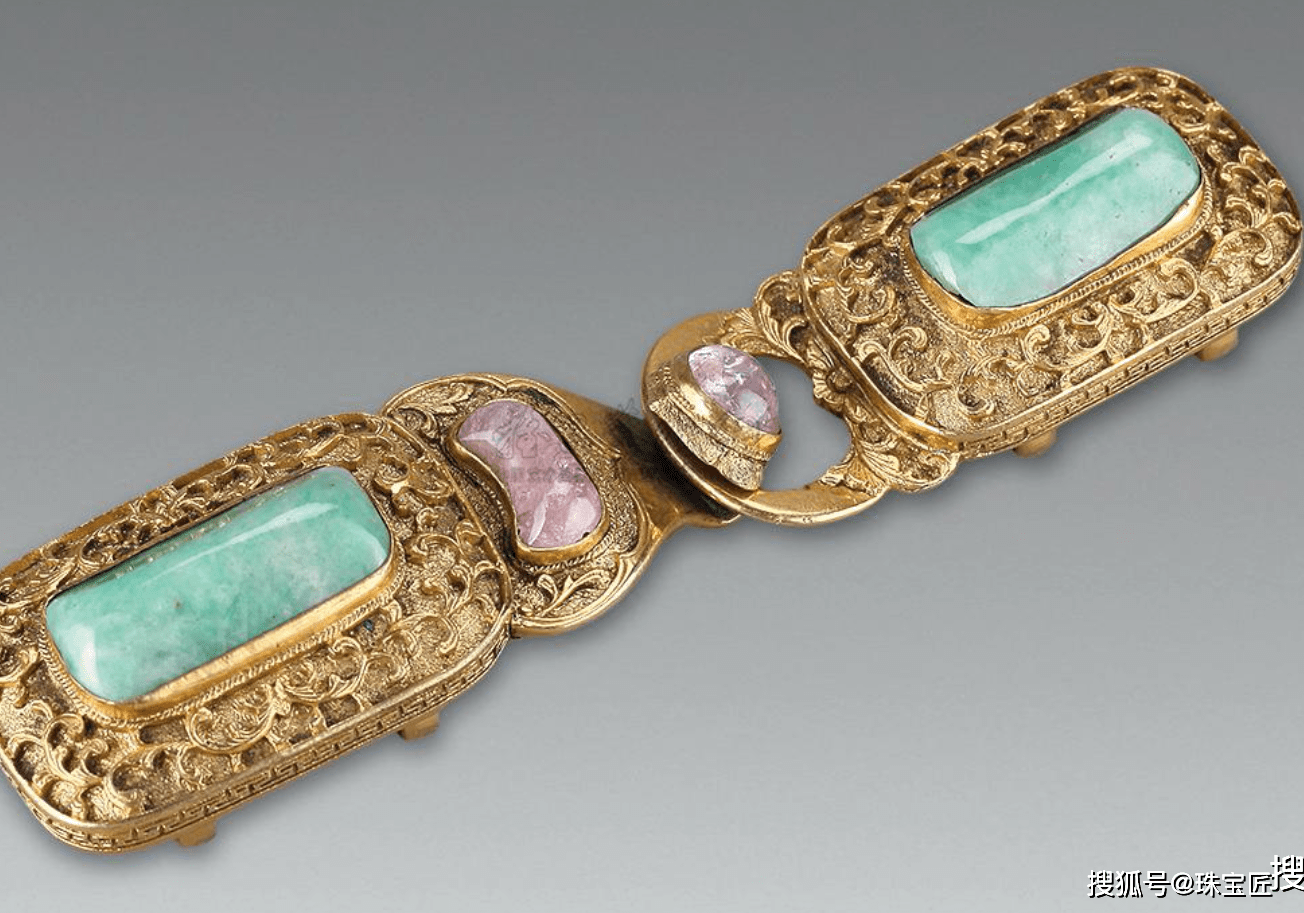 清·铜鎏金卷草纹嵌翡翠、碧玺带扣 | 图源:北京保利
