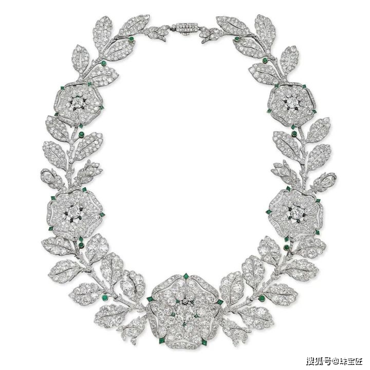 这条卡地亚于1911年制作的祖母绿钻石项链,以小颗粒的祖母绿作为点缀,钻石镶嵌而成的蔷薇花,采用对称设计,无论是叶片还是花卉,都精致考究,将女性的柔美完美的融合其中。