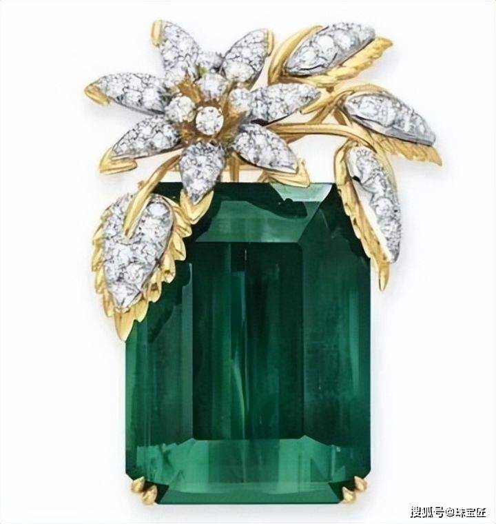 碧玺镶嵌而成的胸针,上面点缀黄金钻石花朵与叶片,造型精致甜美,富有活力。