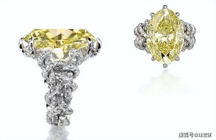 这枚马眼形切割黄钻戒指,主石重15.75克拉,白钻镶嵌而成的线条缠绕成戒臂,将黄钻高高托起,璀璨、耀眼。
