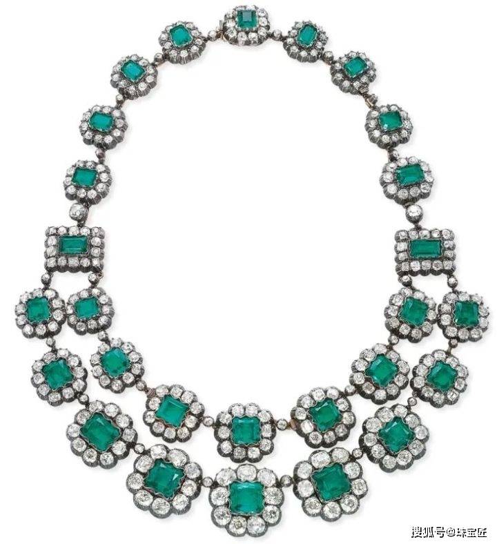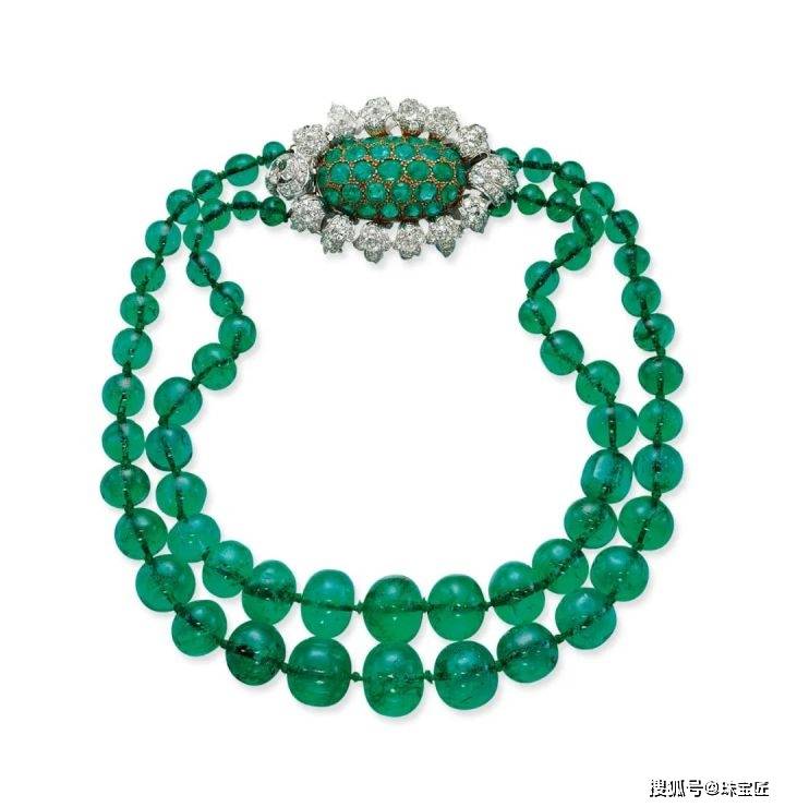 下面这条祖母绿钻石项链,分内外两层,里面的祖母绿圆珠有31颗,外面的有33颗,总重598.71克拉。