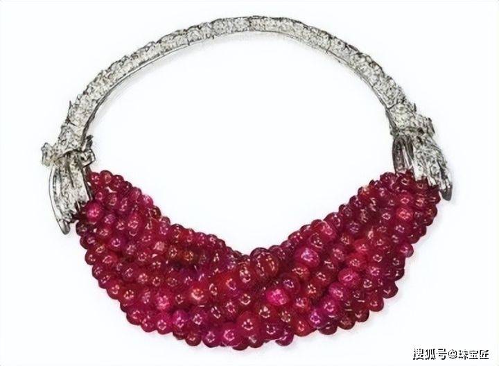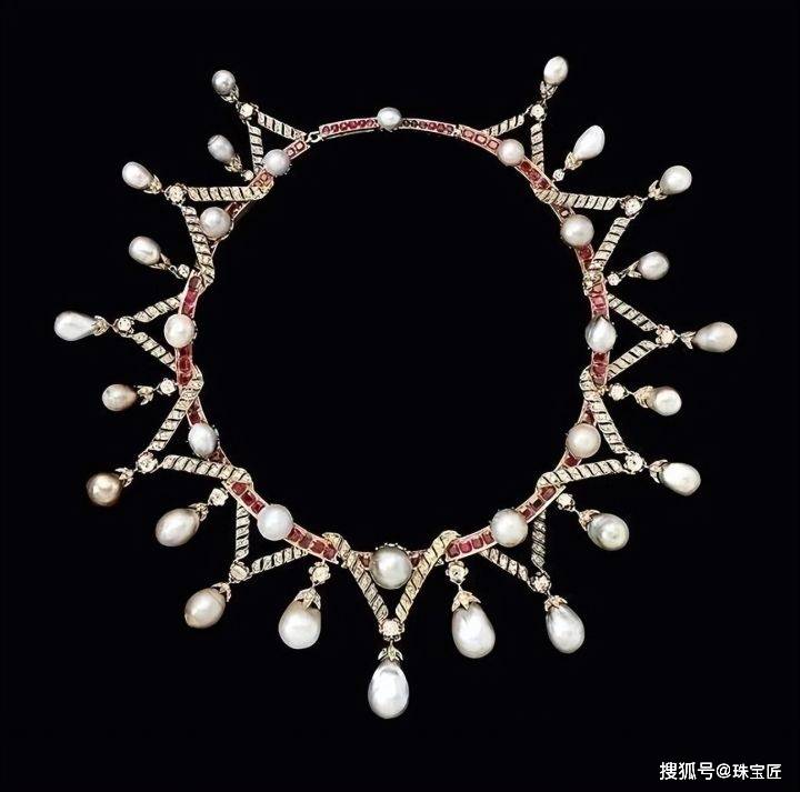 下面这条十分吸睛的红宝石珍珠项链,原属于法国玛丽·安托瓦内特王后,后被莉丽·萨夫拉夫人收藏,大小形状不一的珍珠,被巧妙的搭配其中,设计感十足。