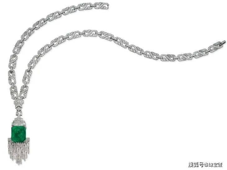 还有这条典型装饰艺术风格的哥伦比亚祖母绿钻石项链,链条的设计十分巧妙,可以拆分成3条手链单独佩戴。