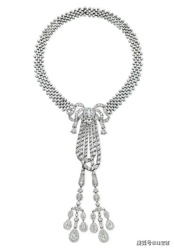 而这条卡地亚经典的缎带钻石项链,造型十分别致,中间的蝴蝶结可拆分成胸针使用,浪漫而梦幻。