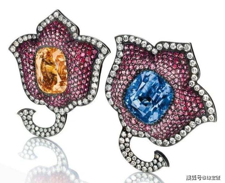 郁金香造型的耳坠,主石为重21.40克拉克拉的橙色蓝宝石和23.80克拉的蓝色蓝宝石,四周以粉蓝宝和钻石点缀,撞色设计,抢眼夺目。
