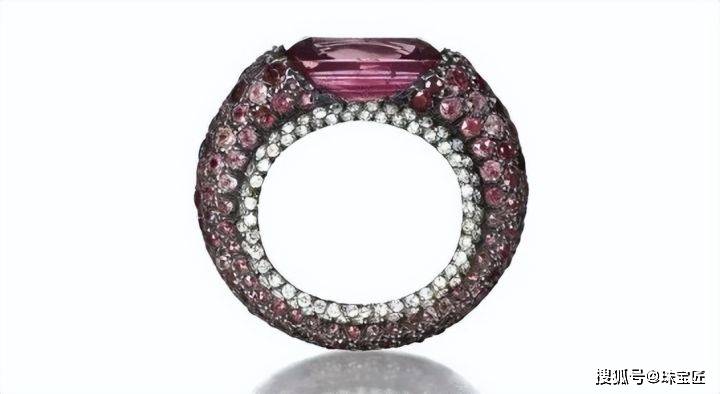 这枚粉色蓝宝石戒指,重7.09克拉,戒臂镶嵌小克拉的粉色蓝宝石与钻石,造型神秘梦幻。