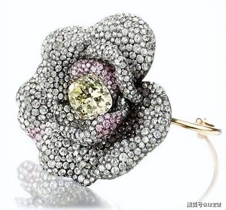同样都是出自JAR之手,这款由钻石镶嵌而成的山茶花手镯,设色淡雅,中间一颗重达13.03克拉的马眼形黄钻十分吸睛。