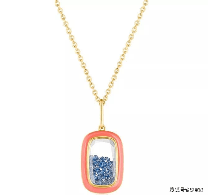 这款金质吊坠,外框是由黄金制作而成,吊坠外边点缀橘黄色珐琅,吊坠中间是装有蓝宝石颗粒的宝石匣,橘、黄、蓝的巧妙配色,尽显活力简约。