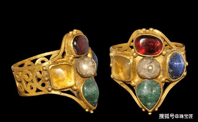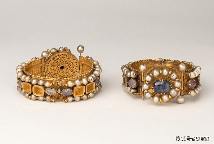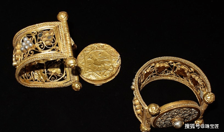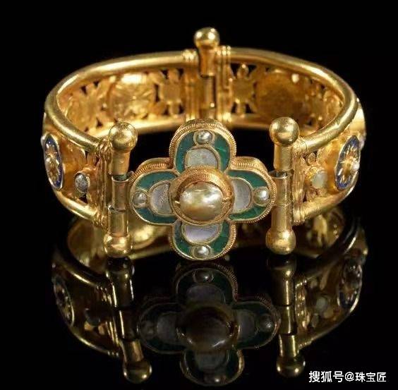这一时期的手镯通常成对佩戴,罗马帝国流传下来的蛇形手镯是当时的时髦款式,还有一种拜占庭风格的手镯,是由金圈与圆盘镶嵌而成,上面饰有珍珠、彩宝,款式十分奢华。