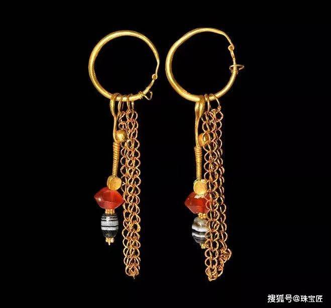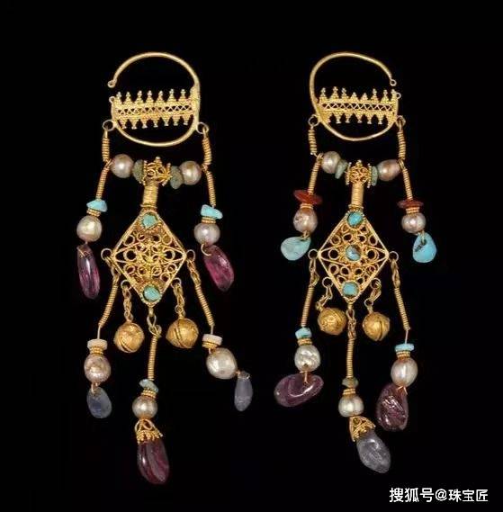 拜占庭时期流行新月形和长坠形耳饰,新月耳饰的材质为黄金,上面雕刻有十字架、孔雀等图案,四周以金珠作为点缀;长坠形耳饰下方坠有彩宝流苏,会随着身体的移动而摇曳生姿。