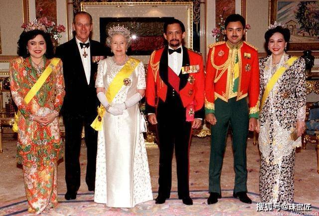20世纪80年代,英女王伊丽莎白二世和菲利普亲王访问文莱,萨拉赫头戴彩钻王冠,身穿彩衣,与头戴王冠身着白裙的伊丽莎白二世同框,至于同框效果如何,大家可以看下图。