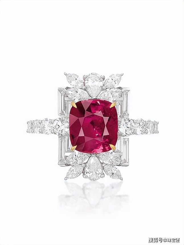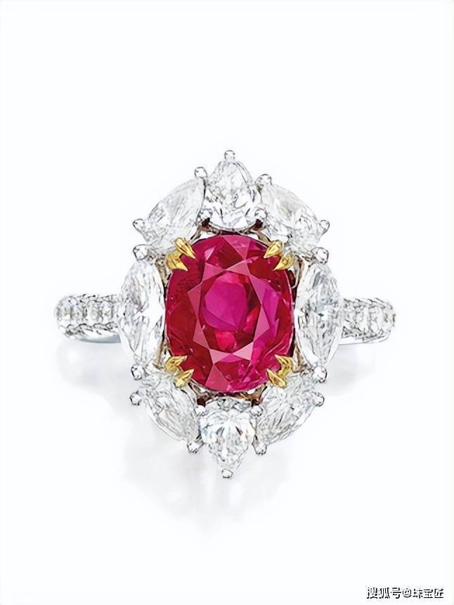 一颗重4.22克拉的椭圆形红宝石镶嵌在梨形和马眼形钻石之间,钻石总重约2.35克拉;18k白金和黄金镶嵌;戒指尺寸6;