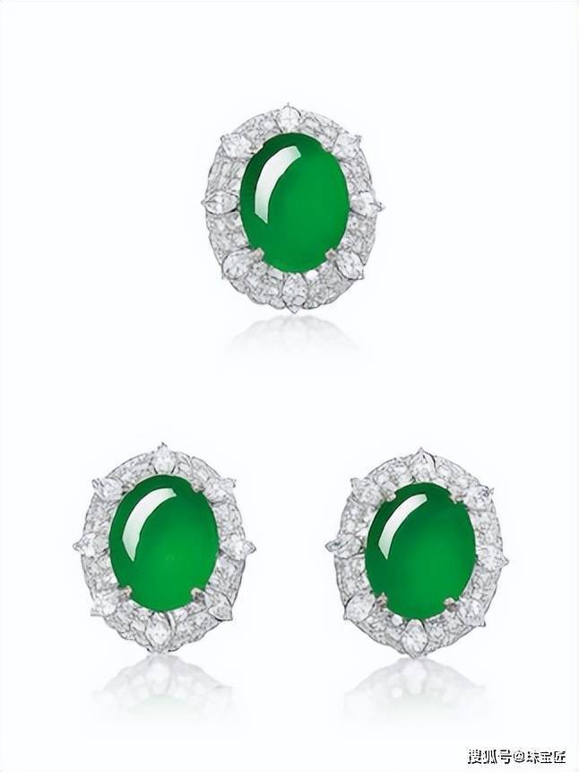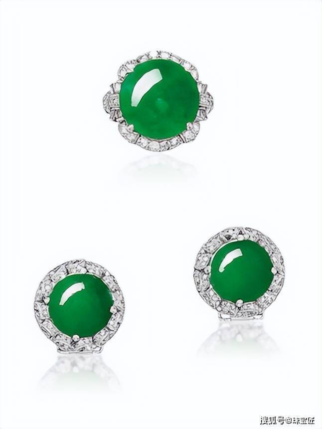 戒指上镶嵌一颗凸圆形翡翠,周围环绕着马眼形和圆形明亮式切割钻石;一对配套的耳夹;总重约9.00克拉的钻石;