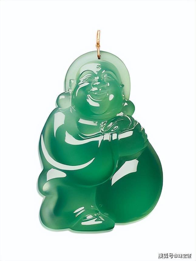 翡翠雕刻成一尊拿着硬币袋的佛像造型;翡翠尺寸约为50.81 x 35.26 x 11.18mm毫米;