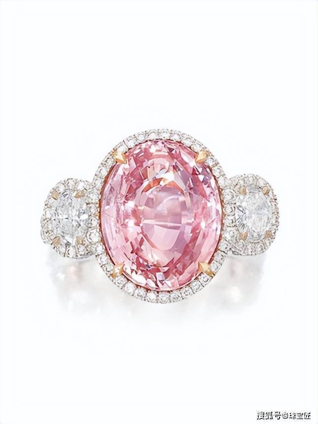 重8.71克拉的椭圆形padparadscha蓝宝石,镶嵌在两颗椭圆形钻石之间,周围环绕一圈明亮式切割钻石,钻石总重约2.60克拉;18k白金镶嵌;戒指尺寸7;