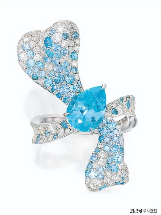 镶嵌一颗重2.23克拉的梨形帕拉伊巴碧玺,点缀以圆形切割的帕拉伊巴碧玺和圆形明亮式切割钻石,总重分别约1.30克拉和2.30克拉;18k白金镶嵌;戒指尺寸6;