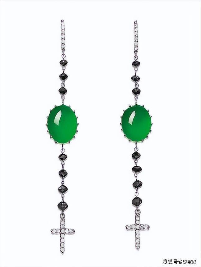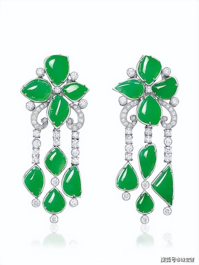 每一组镶有八颗形状各异、亮绿色的翡翠,并点缀以共重约2.25克拉的圆形明亮式切割钻石;尺寸约为9.85 x 7.19 x 4.50mm毫米;18k白金镶嵌;耳环尺寸5.2 x 2.3cm;