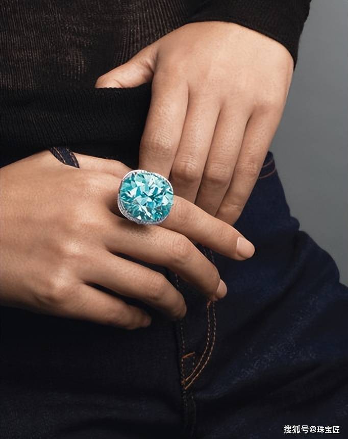 重11.62克拉的枕形帕拉伊巴型碧玺,位于圆形钻石之间,带有椭圆形和梨形玫瑰形切割钻石点缀,钻石总重约3.20克拉;铂金镶嵌;戒指尺寸5;