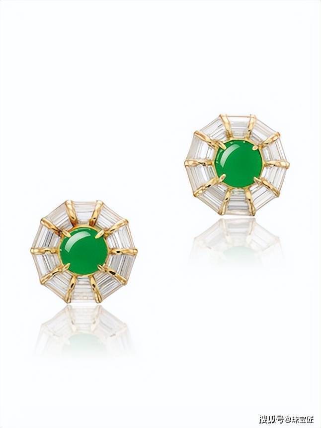 每颗镶嵌一颗亮绿色半透明翡翠,饰有总重约2.45克拉的梯形切割钻石;尺寸约为8.08-8.30 x 2.69毫米;18k黄金镶嵌;尺寸1.8 x 1.9cm厘米;