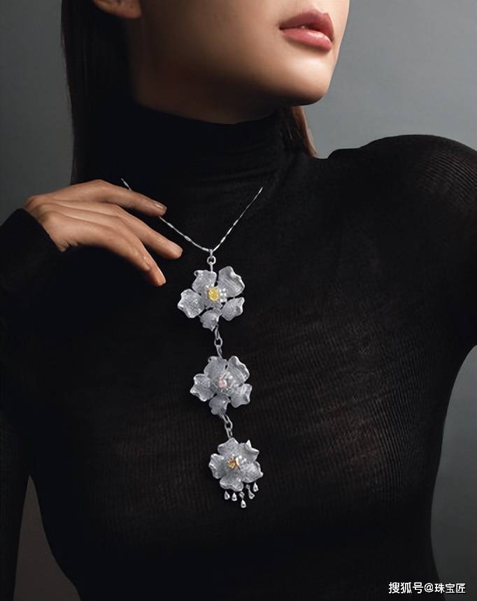悬挂三个可拆卸的花形吊坠,花瓣上密镶圆形明亮式切割钻石,每一朵花形上有一串明亮式切割和马眼形钻石,每一串中心有一颗重3.01克拉的椭圆形浅黄色彩钻、一颗重1.13克拉的光芒四射式切割浅紫色钻石和一颗重1.52克拉的心形深棕-绿黄色彩钻,悬挂在一条镶有钻石的条形项链上,钻石共重约23.00克拉;胸针和挂钩配件;18k白金、黄金和玫瑰金镶嵌;