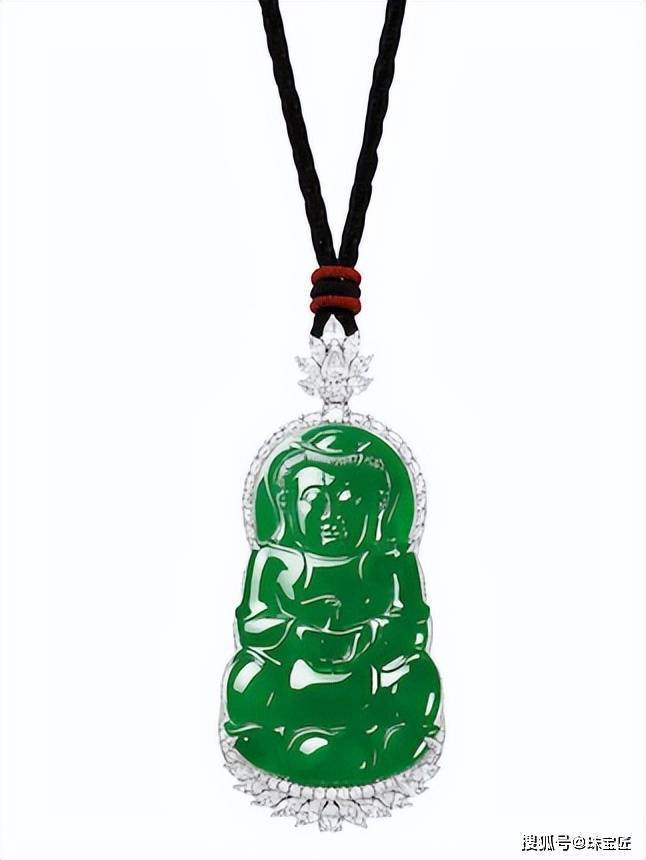 色泽浓郁的翡翠雕刻成“观音”的造型,饰有圆形明亮式切割、马眼形和梨形钻石,钻石总重量约为2.35克拉,由一条黑色细绳装饰;