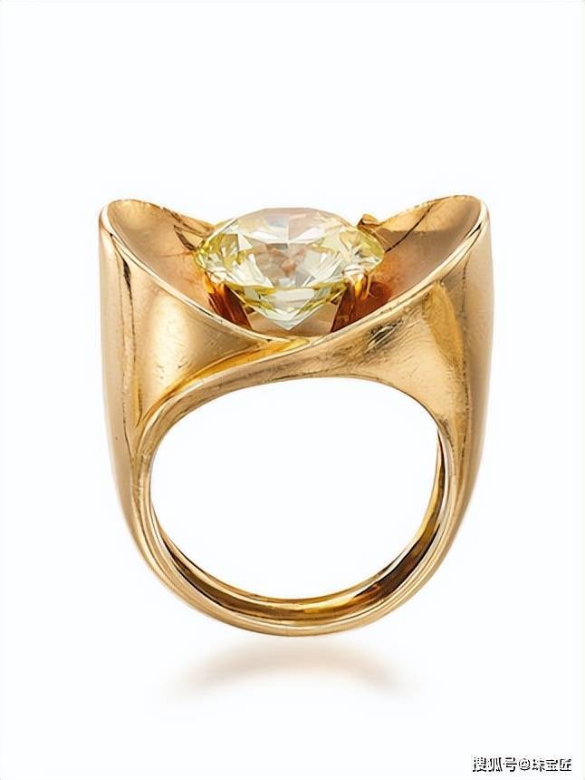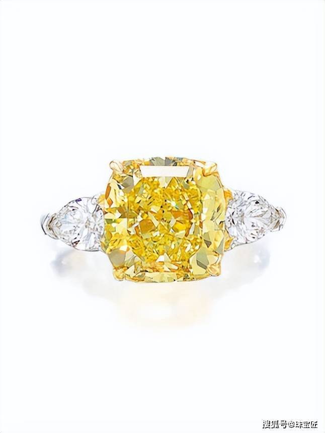 枕形浓彩黄钻,重5.70克拉,两侧镶有各重0.40克拉的梨形钻石;18k黄金和铂金镶嵌;戒指尺寸5;