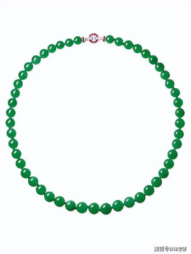 这条翡翠项链是由49颗色泽翠绿、透明度良好的翡翠珠子组成,配以一颗红宝石和阶梯形切割钻石表扣;尺寸约为12.35-9.70毫米的翡翠珠子;长度60.0cm。