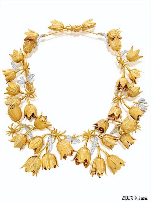 手工制作的花苞独特而优雅,由精致的金蝴蝶结、圆形明亮式切割和梨形钻石镶嵌卷轴和昆虫点缀,钻石总重量约为4.05克拉;