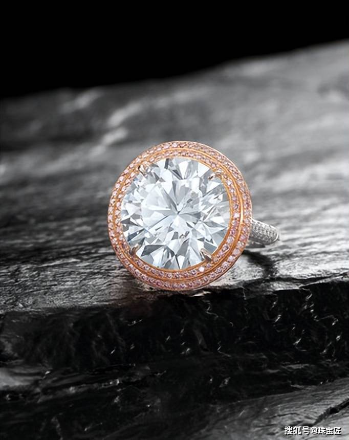 正中间的圆形明亮式切割钻石重达10.56克拉;铂金和18k玫瑰金镶嵌;戒指尺寸5。