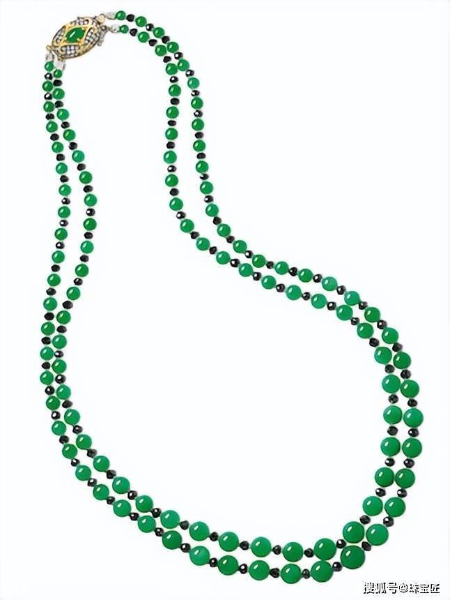 这款双排项链是由翠绿色半透明翡翠珠子和多面黑钻珠子组成,搭配圆形明亮式切割钻石和翡翠凸圆形镶嵌表扣,黑钻总重约34.75克拉;翡翠珠子的尺寸约为9.00-3.45毫米;长度54.4厘米;