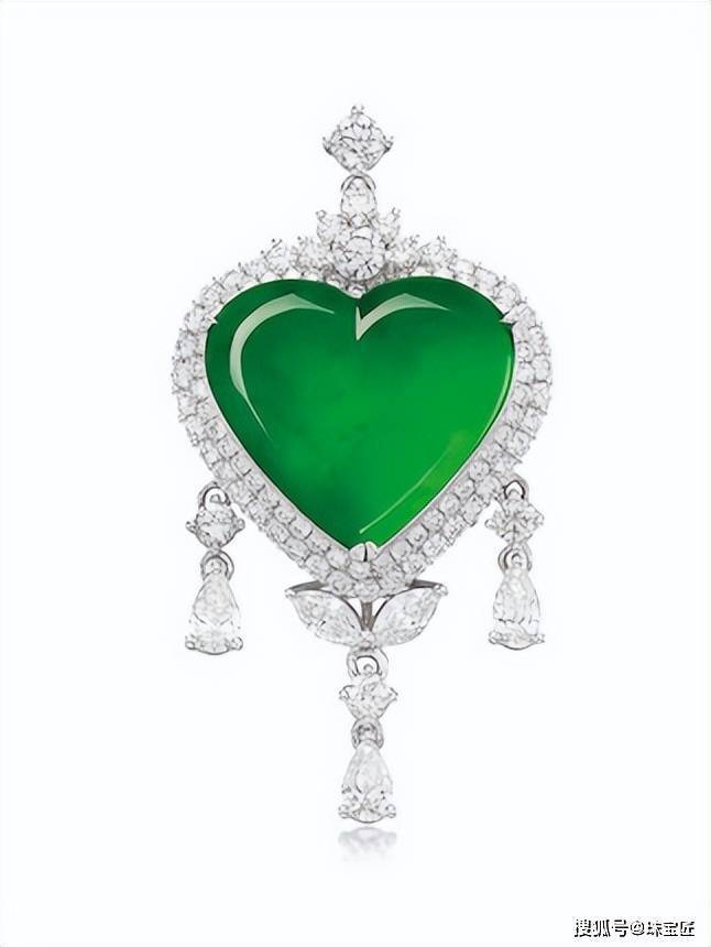 明亮的绿色心形半翡翠,饰有各种切割的钻石,总重约1.75克拉;尺寸约为16.76 x 19.48 x 1.57mm毫米的翡翠;18k白金镶嵌;尺寸4.4 x 2.1cm厘米;
