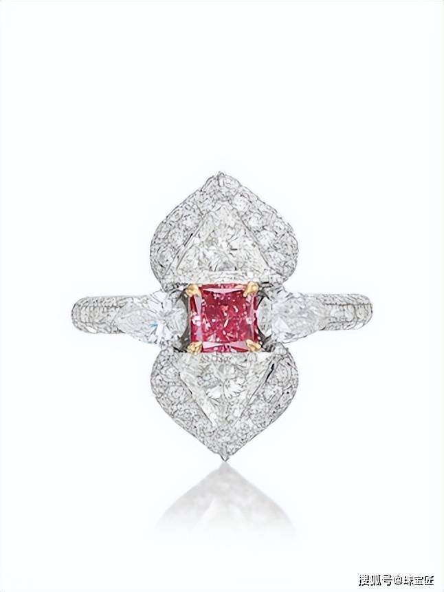 戒指尺寸5,18k白金和黄金镶嵌,镶嵌一颗重0.52克拉的方形改良切割红钻,周围点缀着总重约2.40克拉的trilliant型、梨形和圆形明亮式切割钻石;附美国宝石协会证书和GIA报告;