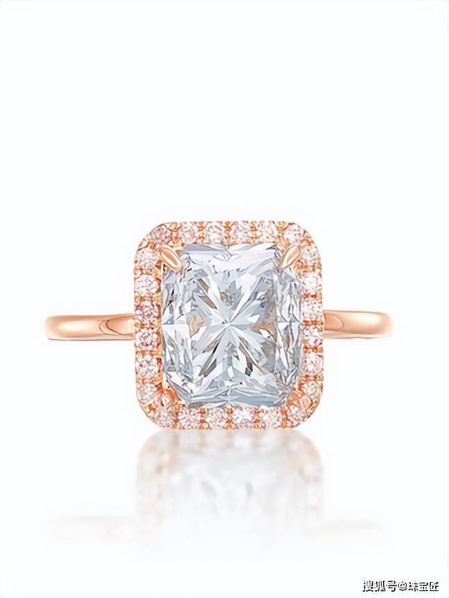 重3.64克拉的矩形明亮式切割淡蓝色钻石,周围镶有粉色圆形明亮式切割钻石;18k玫瑰金镶嵌;戒指尺寸5;