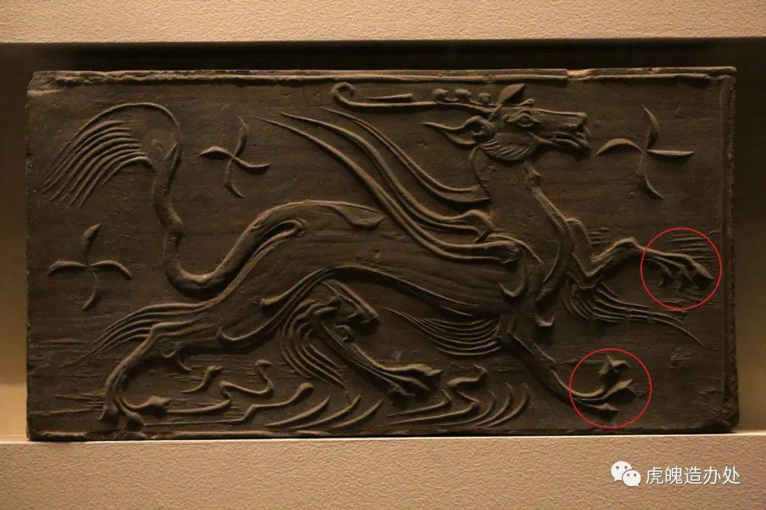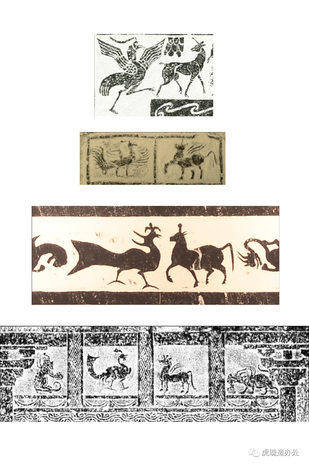 因此,所见南北朝时期没有榜题的此类造型,亦可以归类于“麒麟”。同时,在邓县南朝画像砖墓出土的画像砖中,还有一块与“骐驎”形象画像砖非常相似的造型。其最大的区别是有“兽爪”,而不是“马蹄”(图16)。非常遗憾,这件非常完整的画像砖并没有榜题可做参考。但根据自汉以来“麒麟”的形象来分析,这件有兽爪造型的形象,个人认为暂时不能归类于“麒麟”。