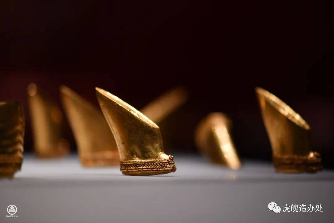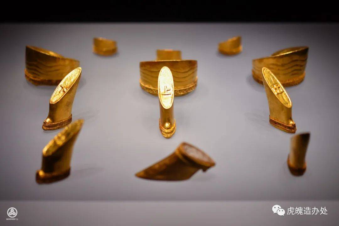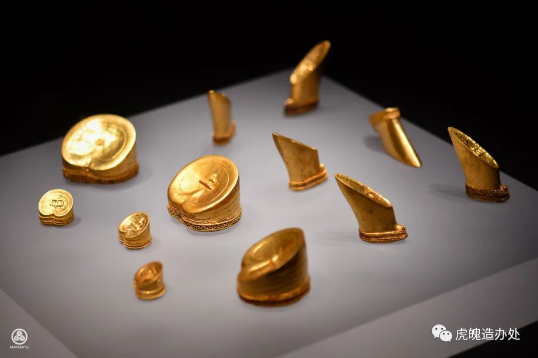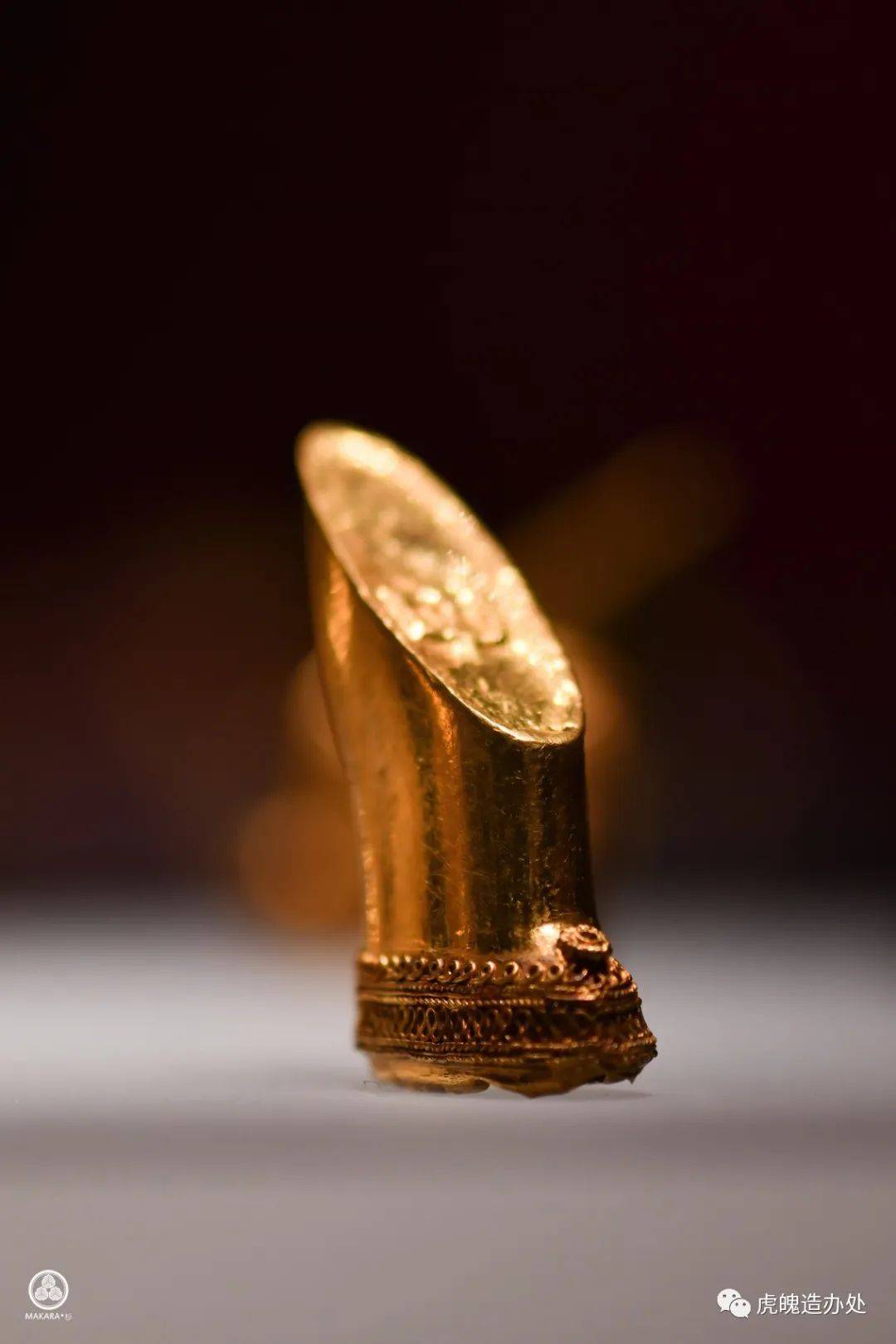2011年~2016年,南昌西汉海昏侯墓出土的黄金数量已达478件,总重量超120公斤。此次发掘共出土马蹄金48件,其中大马蹄金17件,小马蹄金31件。大、小马蹄金其形相似,均为马蹄状,中空、斜壁,前壁高后壁低,呈一斜面,底为较为规整的圆形。麟趾金25件,中空。长斜壁,前壁倾斜度较大,后壁较短。底为椭圆形,其形似鹿趾。上口周缘饰金丝掐成的一组纹饰纹,后侧有一金丝攒成的花蕾状突起,上口嵌琉璃面。通体修长,壁面无波纹,抛光十分光洁【4】。(图10~11)