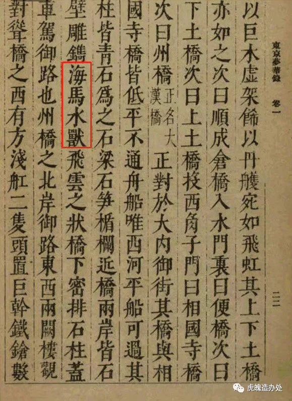 无独有偶,2022年9月28日,河南开封北宋东京城州桥遗址有重大考古发现,并公布了两岸石壁上祥瑞图(图23)。考古公布:主要图案是海马(实际应该是麒麟)、仙鹤和祥云。公布为什么说这是海马呢?纯粹是为了附会《东京梦华录》。宋代孟元老的笔记体散文《东京梦华录•卷一》:“近桥两岸,皆石壁雕镌海马水兽飞云之状。”(图24)