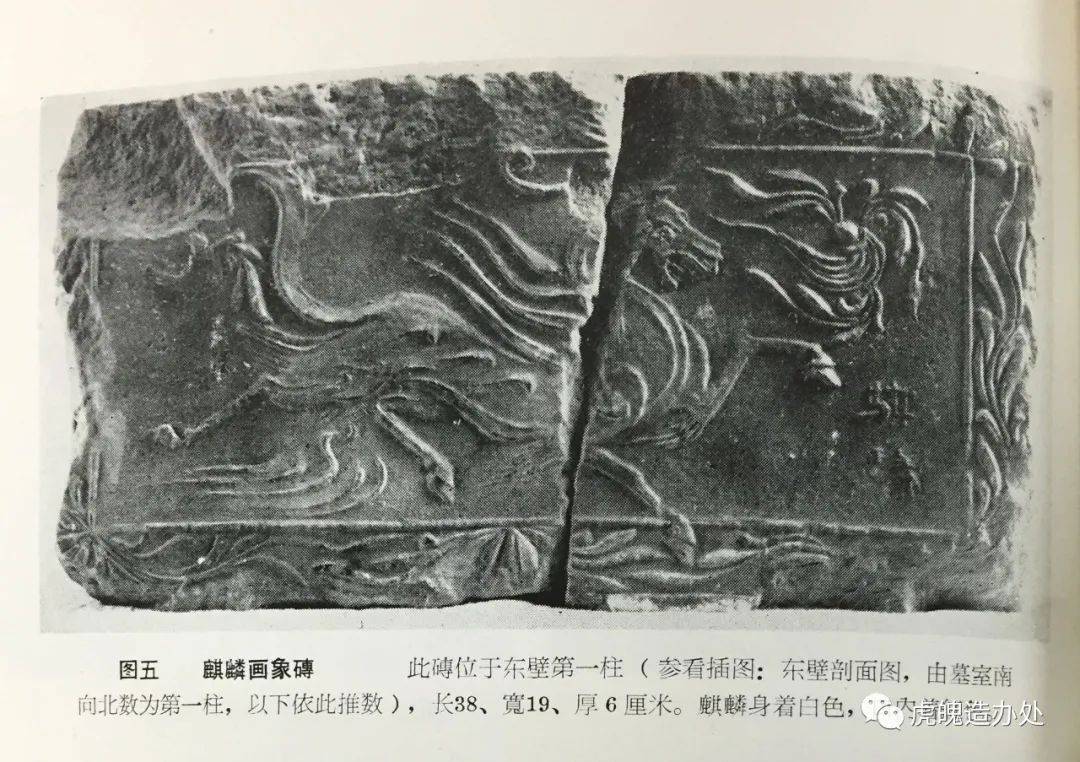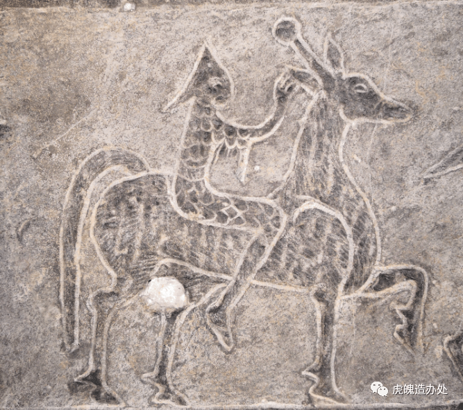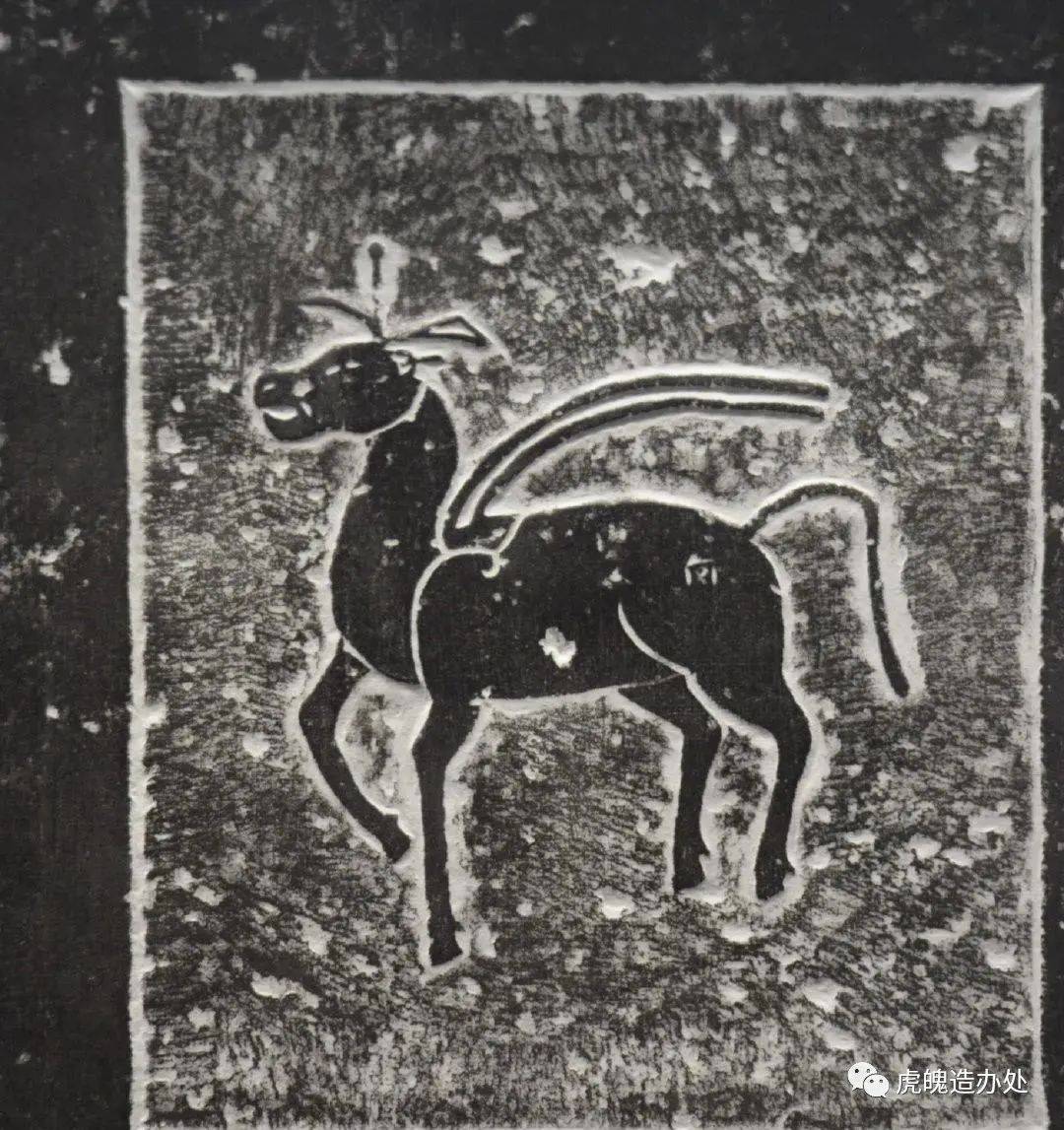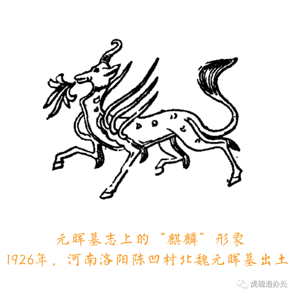 此画像砖上“麒麟”形象与汉代略有不同,最大的变化是其头顶上的角。在南朝画像砖上“麒麟”的形象,有角尖、且角尖弯曲呈钩状,而汉代时期“麒麟”的角是圆顶为“肉髻”状。这种南北朝时期角尖弯曲呈钩状是受东汉“天禄”和“辟邪”形象所影响。南北朝时期出现此造型的“麒麟”亦非仅此一例。还有1926年,河南洛阳陈凹村北魏元晖墓出土墓志上的“麒麟”形象(图15),现收藏于西安碑林博物馆。虽然墓志上无榜题,但其造型与邓县画像砖上的“麒麟”形象别无二致。
