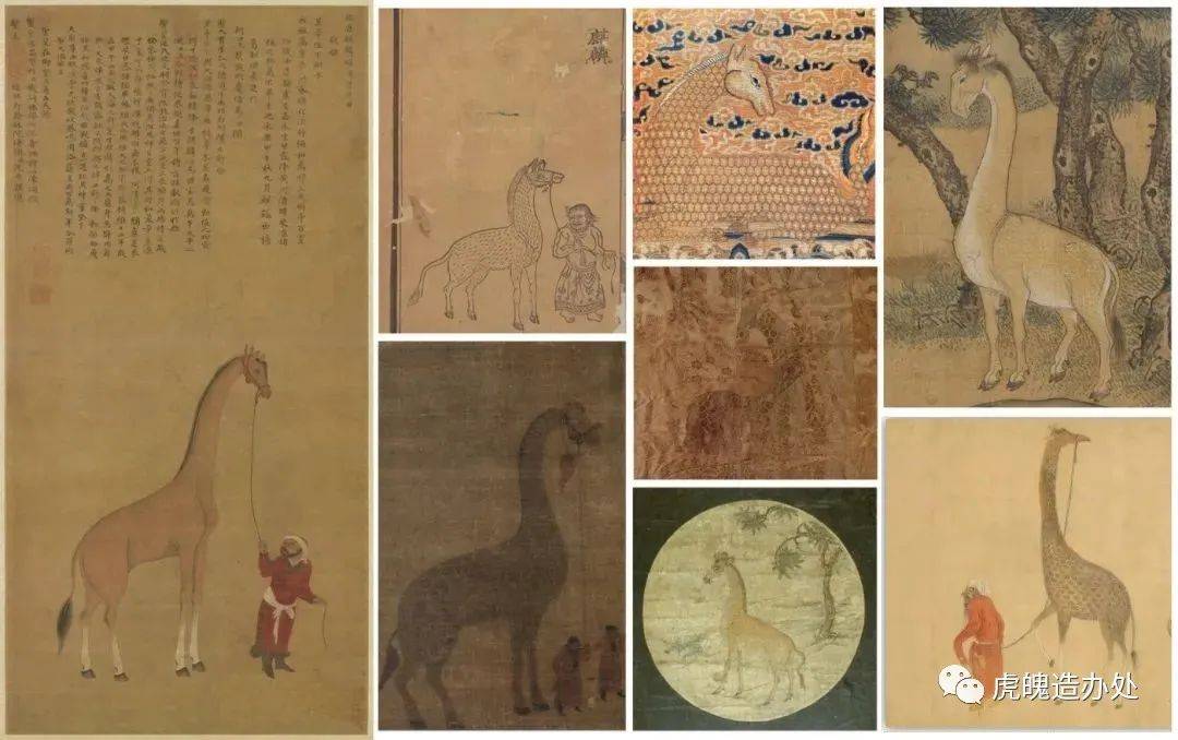 明代绘画及补子中的长颈鹿型麒麟(图32)。长颈鹿在明代称为麒麟,其实非常偶然。首先,长颈鹿并不符合麒麟形象,只有鹿身和肉角沾点边。其次,宋人早就见过长颈鹿,不仅明确记载过其外形,还命名为“駞牛”“徂蜡”,后来清代记载长颈鹿为“恶那西约兽”,和宋人一样没管长颈鹿叫麒麟。可见,只有明代人这么干。让我们把时间拨回1414年。那一年明成祖朱棣亲征漠北,八月凯旋,群臣歌功颂德,九月收到进贡长颈鹿,臣子把它当做祥瑞的麒麟,讨个欢心,岂不美哉?明代特产的长颈鹿型麒麟就此诞生。最后一次长颈鹿入贡发生在1438年,考虑到长颈鹿的野外寿命约20年,可能1458年以后,明人再没见过真实的长颈鹿,画长颈鹿型麒麟只能临摹前作。从永乐到明末,就在这样的临摹传承中,长颈鹿型麒麟的形象渐渐走样。