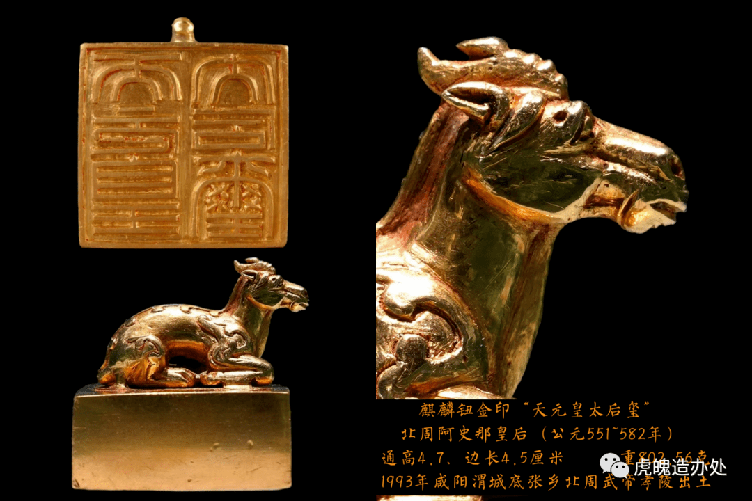 出土的南北朝文物中,除了画像砖外,亦有立体形象的“麒麟”出土。1993年8月,陕西省咸阳市渭城区发生一起盗墓案,位于底张乡的北周武帝孝陵被盗。其中周武帝皇后阿史那氏墓内有一方金质“天元皇太后玺”(图17)。此金印上为一只跪卧的“麒麟”形象,头似鹿或马;头上一角、角尖弯曲;马足圆蹄;肩有羽翼。这些特征与南朝画像砖上的“麒麟”形象完全吻合。同时,《隋书·礼仪志六 》记载北周皇后玺:“皇后玺,文曰‘皇后之玺’,白玉为之,方寸五分,高寸,麟钮。”皇后用玉玺,身为皇太后的玺印使用金质而非玉质,也是合情合理。因此,此玺为麒麟钮无疑。