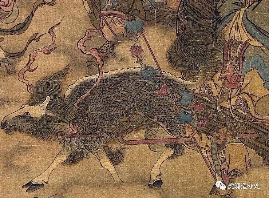 在宋崇宁二年(1103年)出版《营造法式》中,有一张麒麟插图,虽然此图不在原书残卷之中,却还能在一些抄本里找到它。对比故宫所藏的清初抄本和陶湘所藏的民国抄本,两幅麒麟都是龙头麟身,这个特点在宋代以前都不见记载,却是明清至今最常见的麒麟形象,可见现代麒麟在宋代已经基本成型。参考(图26)宋《营造法式》中的麒麟配图,上为清初故宫抄本,下为民国陶本。除了《营造法式》外,宋代可以确定为麒麟形象的文物非常少。台北“故宫博物院”藏有一件南宋马麟绘制的《三官出巡图》,图中有一头异兽被认为是麒麟,体态似鹿,头顶肉角,浑身鳞片(图27)。