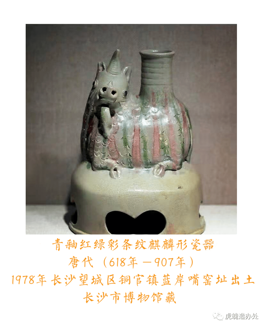 1978年,湖南长沙望城区铜官镇蓝岸嘴窑址出土一件青釉红绿彩条纹“麒麟”形瓷器(图20)。类似器形多见于六朝时期的墓葬中,有学者认为是水注;也有说是烛台或插器等多种名称。长沙窑瓷器的生产年代最早不会晚于贞元十七年(即公元801年),最迟不会早于五代天成四年(即公元929年)。具体来说,长沙窑兴起于八九世纪之交,盛于晚唐,衰于五代。