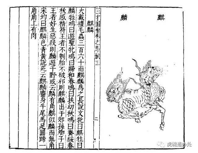 明代王圻、王思义在《三才图会》中有关“麒麟”形象的图像及文字记载 (图35)。西汉礼学家戴圣所编《礼记·礼运第九》:“麟、凤、龟、龙,谓之四灵”。可见麒麟地位起码与龙同等,并不低于龙。