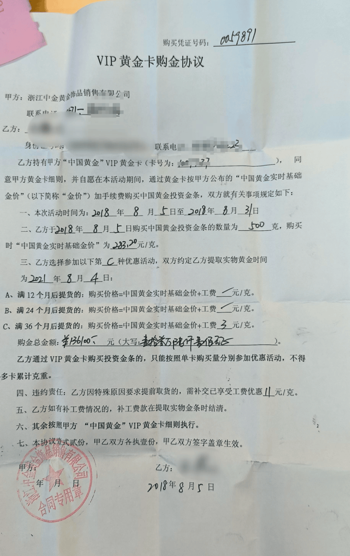 随后,她在门店签署了一份“VIP黄金卡购金协议”。根据协议,毛女士向“浙江中金黄金饰品销售有限公司”购买500克投资金条,当天实时基础金价为283.20元/克,毛女士选择参加“满36个月后提货”的优惠活动,享受工费优惠11元/克,支付总货款136100元。如果毛女士因特殊原因需要提前取货,需要补交优惠的金额。