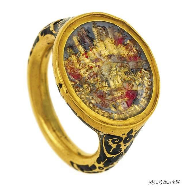 下面这枚金质印章戒指,戒指的戒面上镶有一颗彩绘水晶,雕有一枚融合了牛头、双角、尖角帽、小丑、长颈鹿和孔雀尾巴6种元素的图案,在戒指指环的2侧绘有黑色珐琅的纹样。
